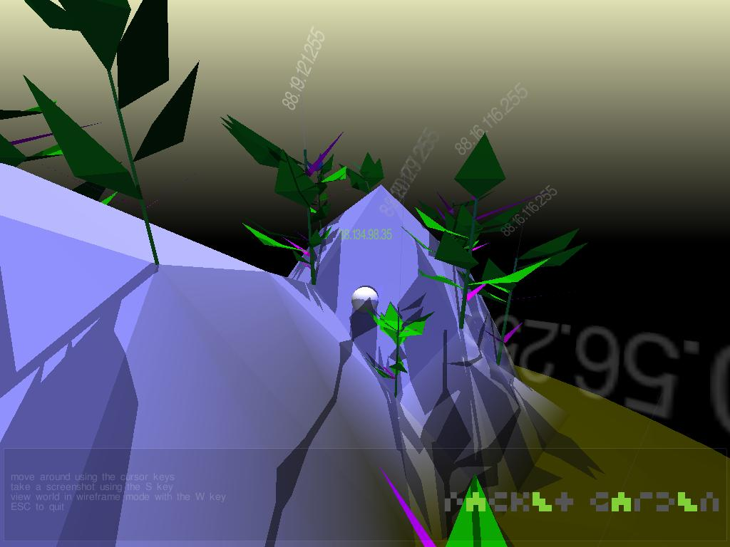 Basic plant-life now populates throughout the world, each plant representing a website visited by the user. Common protocols like SSH and FTP will generate their own items, visible on the terrain. Collision detection has also improved, aiding navigation, which is done with the cursor keys. I've added stencil shadows, a few other graphic features and am on the way to developing a basic user interface.