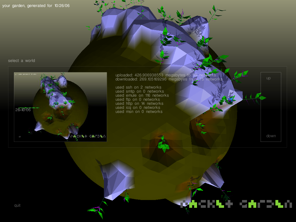With each day of network activity a new world is generated, each of which are stored as tiny files for you to browse, compare and explore as time goes by. Think of them as pages from a network diary. I hope to grow simple plant-like forms from information like dropped packets also, but let's see if I get time..