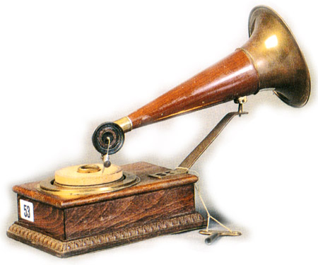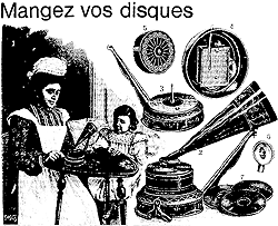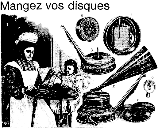 The ad on the left promotes a toy turntable that played records made of sugar and chocolate. The price of six records was 1,90 francs while the turntable was 3.90. The thing was produced by a well known german candy manufacturer 'Stollwerk' in 1905. The dimensions of the box are 16x12x5,5cm, while the horn is 18cm long. |