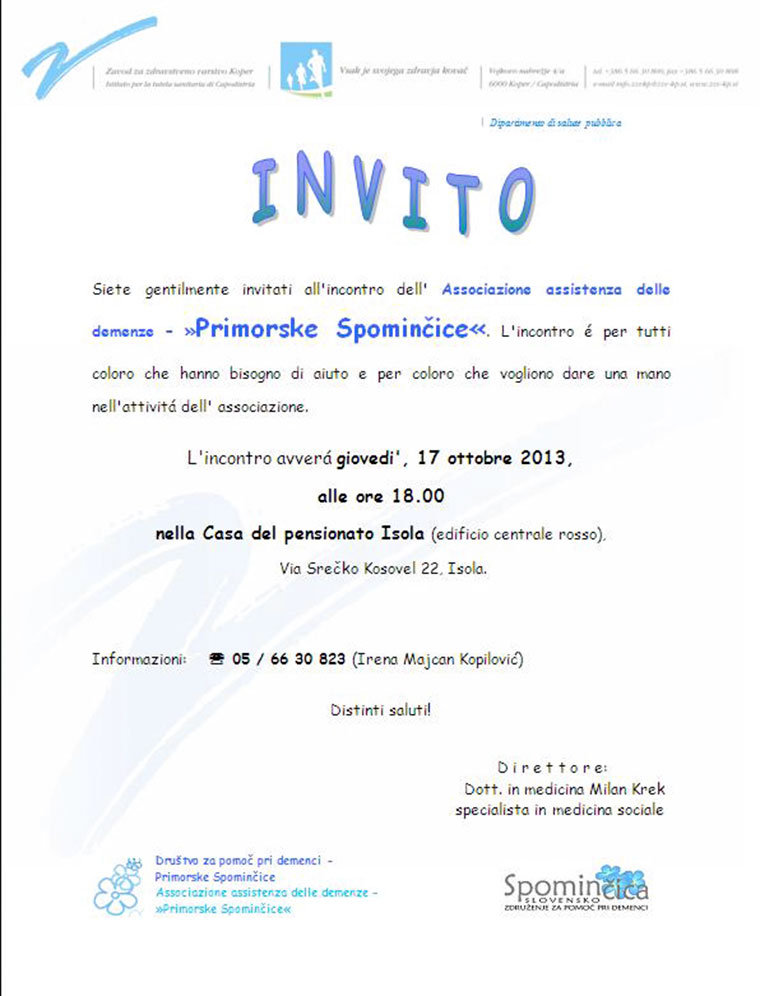 Siete gentilmente invitati all' incontro dell' Associazione assistenza delle demenze - Primorske spominčice. L'incontro avvera giovedi, 17. ottobre alle ore 18. Clicca sull'imagine!