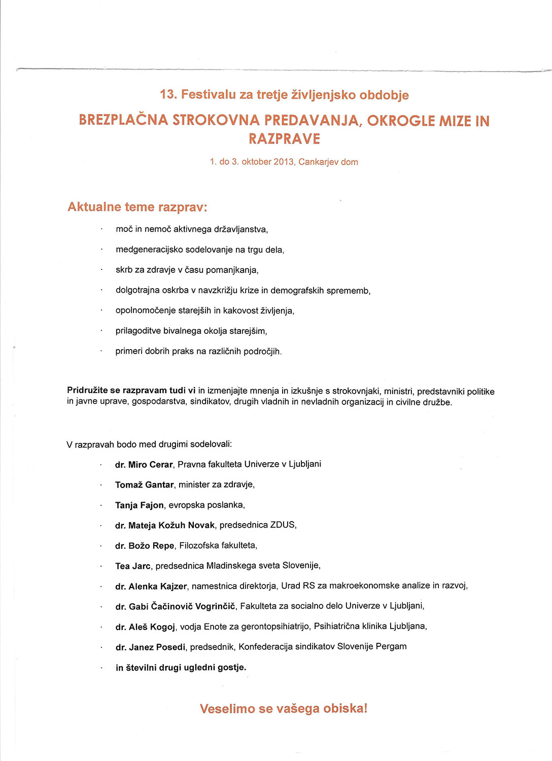 • 13. festival za tretje življenjsko obdobje. Brezplačna strokovna predavanja, okrogle mize in razprave od 1. do 3. oktobra v Cankarjevem domu, Ljubljana. Sodeluje tudi izr. prof. dr. Aleš Kogoj. Podrobnosti!