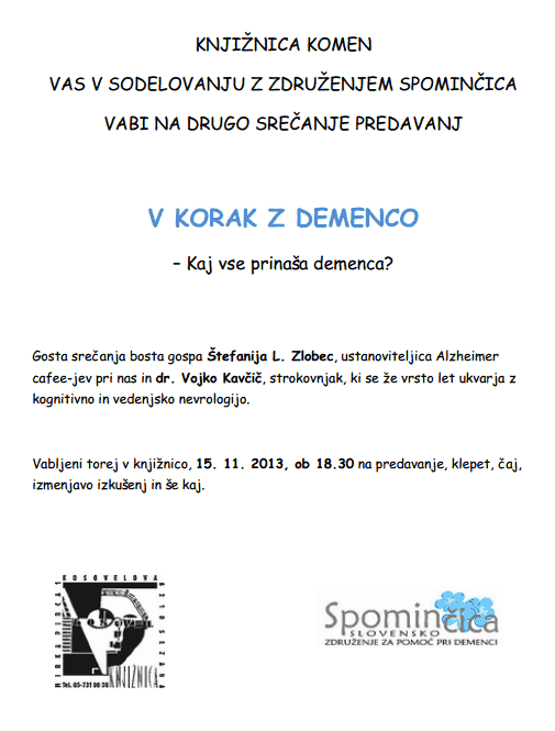 V sredo, 13. novembra, vas ob 15.30 vabimo na Alzheimer cafe v Dom upokojencev Jesenice. Gostja bo Štefanija L. Zlobec!