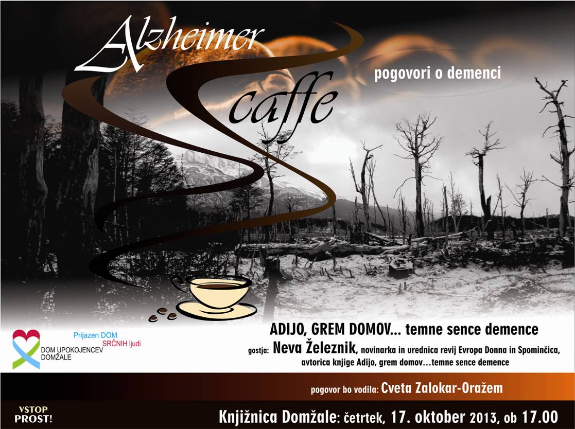 V Knjižnici Domžale bo v četrtek, 17. oktobra, srečanje Alzheimer cafe z naslovom Adijo, grem domov...temne sence demence. Gostja večera bo novinarka Neva ŽELEZNIK, avtorica knjige o izkušnji z demenco v družini "ADIJO, GREM DOMOV ... TEMNE SENCE DEMENCE", pogovor bo vodila Cveta Zalokar Oražem. (Klik na sliko za podrobnosti)