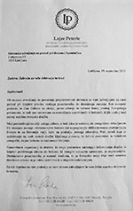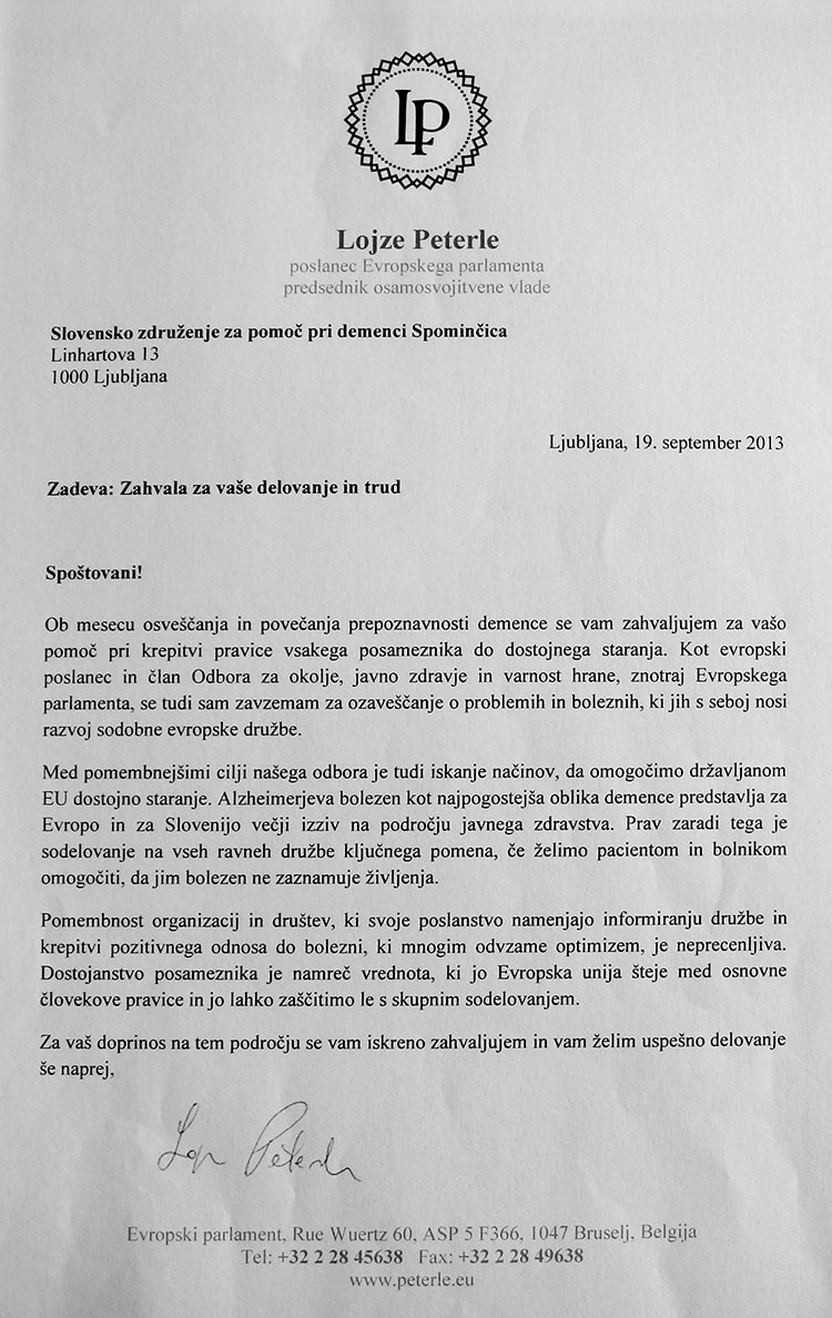 Zahvala evropskega poslanca Lojzeta Peterleta Spominčici.