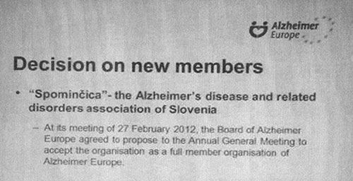 Odbor Alzheimer Europe je na svoji seji potrdil Slovenijo kot novo stalno članico 27. 2. 2012 v Bruslju, po enoletnem pripravljalnem obdobju.