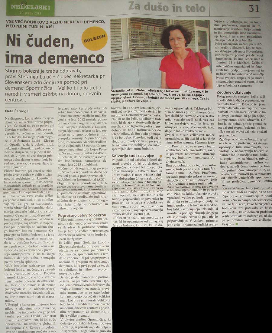 1.9.2013 je kot samostojna priloga pri reviji Naša žena izšlo glasilo SPOMINČICA. Glasilo je izšlo v VELIKI NAKLADI 18.000 izvodov z namenom, da bi postale informacije o tej hudi bolezni dostopne širši javnosti.