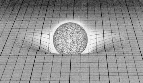 A massive body like the sun causes the fabric of space to warp, somewhat like the effect of a bowling ball placed on a rubber sheet.