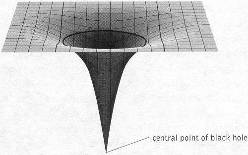 Figure 3.7 A black hole warps the surrounding spacetime fabric so severely that anything that comes within its "event horizon"—illustrated by the dark circle—can't escape from its gravitational grip. No one knows exactly what happens at the deepest interior point of a black hole.
