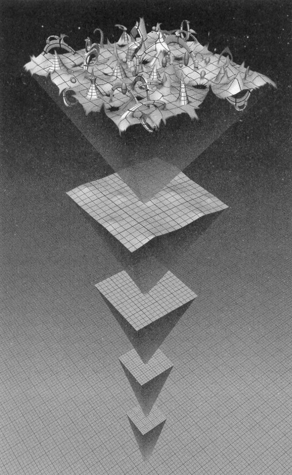 Figure 5.1 By sequentially magnifying a region of space, its ultramicroscopic properties can be probed. Attempts to merge general relativity and quantum mechanics run up against the violent quantum foam emerging at the highest level of magnification.