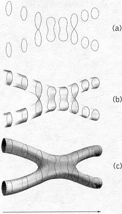 Figure 6.7 (a) Two strings on a collision course can merge into a third string, which subsequently can split apart into two strings travelling along deflected trajectories. (b) The same process as shown in (a), emphasizing string motion. (c) a "time-lapse photograph" of two interacting strings sweeping out a "world-sheet."