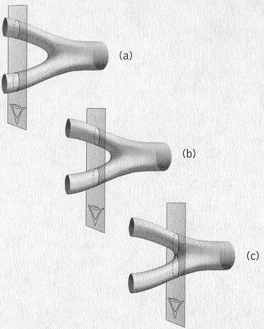 The two incoming strings from George's perspective at three consecutive moments in time. In (a) and (b) the strings are getting closer together; at (c) they touch for the first time, from his viewpoint.