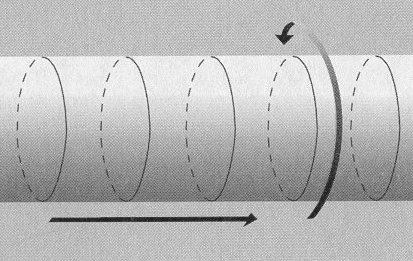 Figure 8.2 The surface of the garden hose is two-dimensional: one dimension (its horizontal extent), emphasized by the straight arrow, is long and extended; the other dimension (its circular girth), emphasized by the circular arrow, is short and curled up.