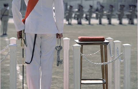 bb-gbr-132.jpg Parade in honor of the birthday of her Majesty the Queen. Since the capture of the Rock in 1704 the Keys of Gibraltar have symbolized the possession of the Fortress by Great Britain. The Keys have come to be regarded as the seals of the office of the Governor and as such are handed over from one Governor to the next. |