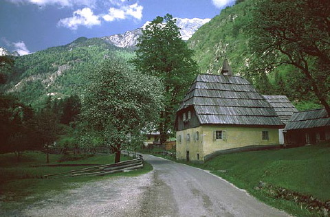 Slovenian countryside with view of Kamniske-Savinjske Alps.