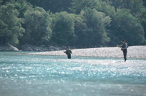 Triglav National Park, Soca River valley. Fly fishermen pursue the Soca trout.