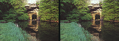 Spodnji polsliki poskusite »prekrižati« z delnim škiljenjem. Najlažje bo, da si pomagate s prekrivanjem izstopajočega objekta na sliki, v našem primeru naravnega mosta.