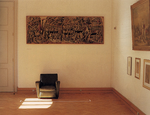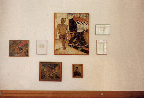 The selected fine art works have followed the problems of the body in two directions (which, however, intersected frequently and were therefore in most cases impossible to discern); the body as an index of the immersion of the individual in the symbolic net (the ideology, the collective, the "masses") on the one hand, and the physical presence and consequent healing of the body (which escapes symbolic reality) presented through extreme emotive conditions, torture, pain, injury (the substance of life), on the other. The works of art, the artefacts, and the musem and office fittings were all aranged in sets of particular significance to create mutual dialogue, tension, ore even opposition.