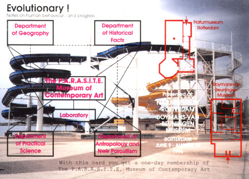 Invisible host at Naturmuseum and Boymans Museum Rotterdam. Green corridor with European theories and concepts of the developements in natural sciences and anthropology (creationism, hyperselectionism, evolutionism, gradualism, dialectics, etc.). Used materials: statements and quotations, art works from Boymans collection, works from Applied Art Department, works from P.A.R.A.S.I.T.E. Musem collection. |