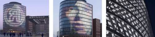 Well, this is one of those things that make this city so desperately awsome isn't it. The SPOTS media facade opened today at 17:00 on the frozen Park Kolonnaden building. As you can see in the pics, a few series of curated art projects will be delivered for free to a hopefully delighted walking audience for 18 months. You can also buy little postcards with changing images on them. The installation was designed by Realities:United, a Berlin-based architecture studio, also responsible for the amazing BIX facade at the Kunsthaus (Graz).