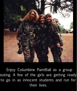 Well, perhaps it would be a little more exciting if it wasn't a hoax, but if an entire 20thC art movement could be based on the works of artists who didn't see the point in actually realising any of their ideas, then there's probably not much point in us moving far beyond the 'concept' now - providing your imagination is actually strong enough to put yourself in the shoes of a student who decides to walk to school one day wearing a t-shirt that says 'serial killer', carrying a duffel bag laden with a 20-lb propane bomb, pipe bombs, fire bombs, molotov cocktails, a sawn-off shot gun, and a 9mm Tec-9 semi-automatic pistol, planning to kill at least 500 students, asking them before they die, whether they believe in god.