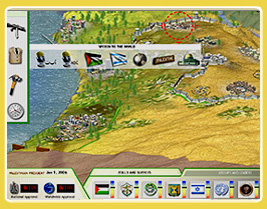 As yet unreleased, but topical nonetheless: "PeaceMaker is a one-player game in which the player can choose to take the role of either the Israeli Prime Minister or the Palestinian President. The player must react to in-game events, from diplomatic negotiations to military attacks, and interact with eight other political leaders and social groups in order to establish a stable resolution to the conflict before his or her term in office ends."