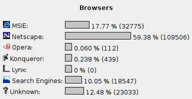 Yes, it's offtopic, but since 1999 I've always taken interest in the webstats for visitors here at selectparks. In the last 6 months more and more people have been dropping Internet Exploiter in favour of Firefox (or Mozilla itself). Also interesting are stats that we sneakily pry from you every time you check the page: about 23% of you have been using a Microsoft OS, 7% Linux and a whopping 38% are Mac machines. Another 30% are 'Unknown' which statistically speaking usually comprise Linux/UNIX users. Without putting on a Che Guevara t-shirt, it's clear somethings on the boil..