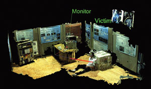 The realization of the interiors were done with the first-person-shooter game Unreal Tournament 2003. With stills from the movies, the architecture of the rooms was estimated, and the textures recreated.