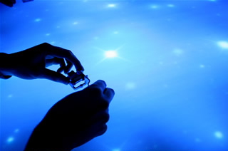 Chris of Pixelsumo wrote to me about a collaborative project he worked on that uses a light-table and small sound-toys. Reverberations from the units are sensed by the table and are represented by ripples and other events, much as they would in a pool of water.