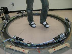 Hiroo Iwata's Stringwalker has to be one of the strangest input devices developed to tackle the old problem of emulating bipedal navigation in a 3D world. This controller comes in the form of a pad and a pair of shoes attached to a system of 8 pullies and sensors. There's not a whole lot online about it, but it appears that when you move a foot around - for instance in a step motion - the distance and trajectory of that movement is calculated based upon the direction and length of string that has passed over the pullies. This is then used to scroll the world accordingly. It also appears that by using motors attached to these pullies the system, they might even be able to simulate the exertion experienced when walking up a hill, for instance. Expecting to see this one in an arcade is a bit of a stretch. Interplanetary-colonist-in-training? Perhaps. Stringwalker will be on show at Siggraph 07. Via Gizmag.