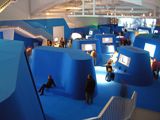You'd be right to think Gijon, Spain might seem like an unlikely place to host the largest exhibition on the field of artistic games to date. This didn't stop thousands from attending, many who flew in for the show. The great turnout was of course also due to the fact that Gameworld was just one of four concurrent exhibitions inaugurating the opening of the Laboral, the gigantic new Asturian art center (North of Spain). I arrived on Tuesday after spending a few sleepless nights working on my own piece for the exhibit, a 2 player version of my Second Person Shooter in the form of a QuakeIII mod. I had no idea quite what to expect, though I'd helped out curators Carl Goodman and Daphne Dragona a little with advice on what shape the show should've taken. I walked into an enormous interior partly-clad blue landscape, a lot of hardware, whirring drills and a few dozen people looking quite confused about it all. This is what it looked like less than 36 hours before the opening (thanks to Feizi for the snap). Cutting to the chase, here's the lineup (taken from Pau's post here): Read on for more..