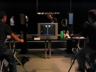 When I wrote about Pong Mythos a week ago, I had no intention of going to the GC to see it, but a brief glance at a map proved that I was close enough to make the jaunt. The GC itself was a whopper of an event, but mostly in the sense of sheer scale - fairly earning it's reputation as the 'European E3' - with the vital ingredients of shameless product pimping, X-Box 360 giveaways hawked by pop-stars (Arrested Development of all people) and blood-splattered sandbags. From within an hour of being there it was clear there was far too much hype - to the point of being scary - for these train-weary eyes, so we did away with it and ran straight to Pong Mythos, a show put on by the Computer Spiele Museum here in Berlin. Pong Mythos presented an impressive range of interpretations (even remixes) of Pong, both as a concept and as the atomic root of videogaming itself. Read on for more..