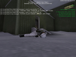 Dead-in-iraq, by artist Joseph DeLappe, is a performance piece conducted inside the US Army recrutment game, America's Army. I enter the game using as my login name, "dead-in-iraq" and proceed to type the names using the game's text messaging system. As is my usual practice when creating such an intervention, I am a neutral visitor as I do not particate in the proscribed mayhem. Rather, I stand in position and type until I am killed. Upon being re-incarnated I continue to type.