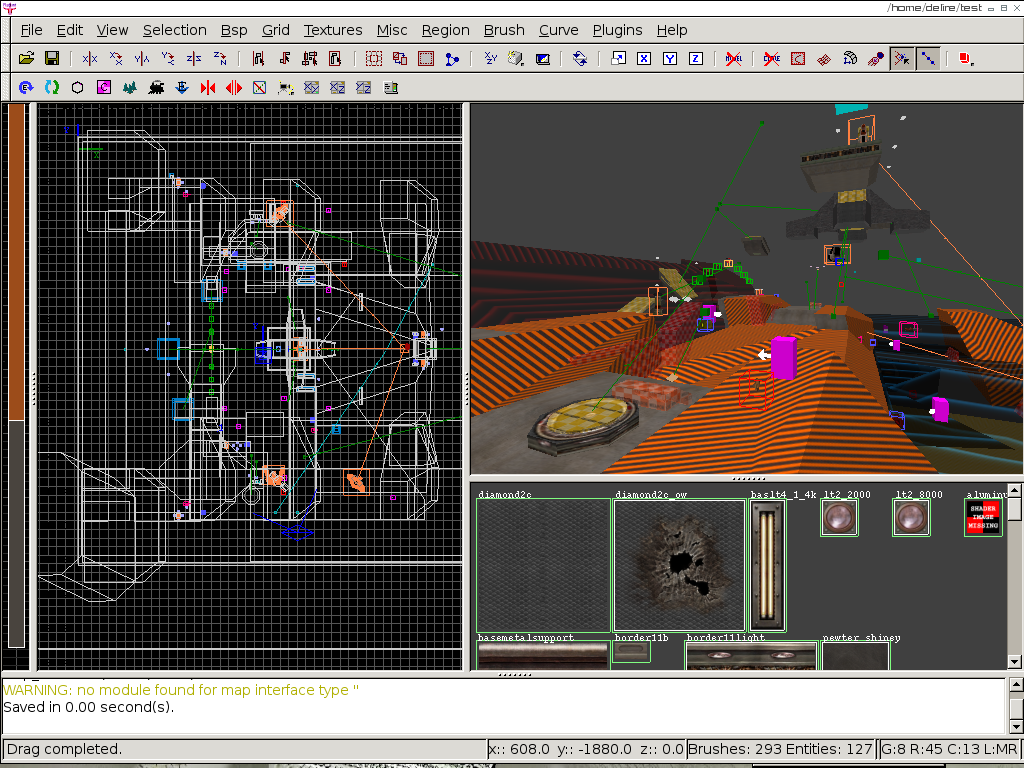 The community for GtkRadiant is very active as it is the most popular editor for many of these games. It has a plan-view interface with a good 3D windowand texture browser. Scene textures and all entities being used in the game (and their relationships to other objects/entities) are visible in the 3D view.